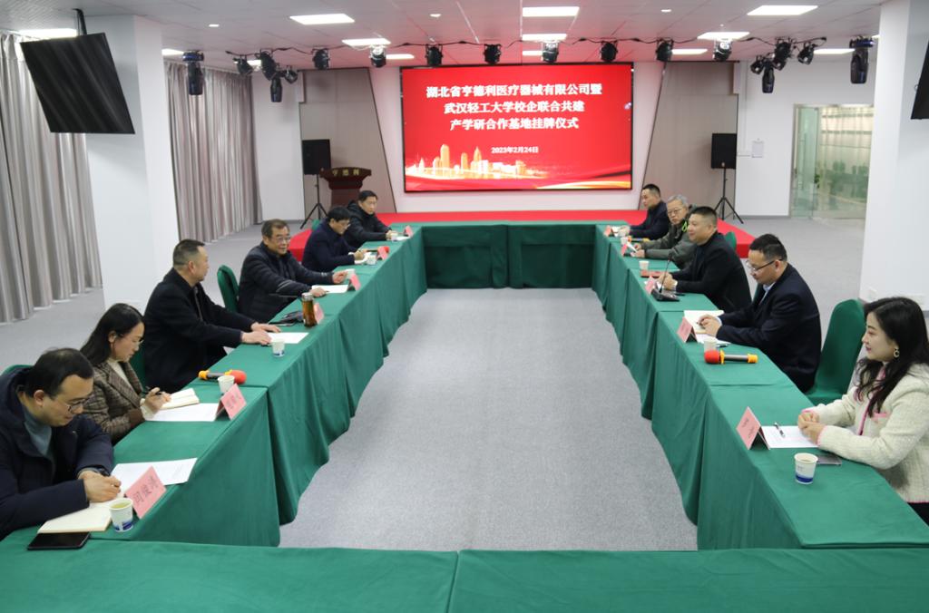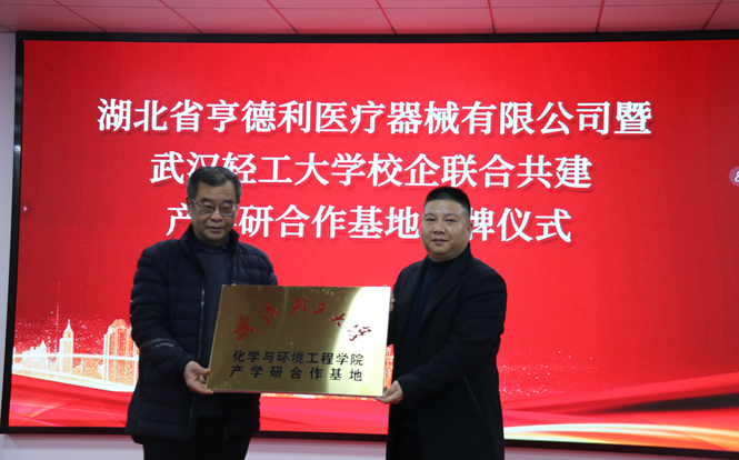 2月24日下午,beat365官网中文版本校企联合共建产学研合作基地挂牌仪式在湖北省亨德利医疗器械有限公司二楼多功能会议厅举行,beat365官网中文版本经理宋光森、副经理闫俊涛、化工系主任范国枝、孝感市科技局副局长付思源、孝感市科协副主席丁金元、郑俊杰、孝感市应用技术研究所所长许功、湖北省亨德利医疗器械有限公司总经理陈雷、副总经理蔡赟、黎章富、总经理助理罗青出席挂牌仪式。