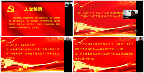 首先,汪董事长领读入党誓词,随后汪董事长深入细致地向全体党员解读了党的二十大会议精神。他从二十大会议主题、党在过去十年工作取得的历史成就、马克思主义中国式现代化、全党统一思想、中国第二个百年奋斗目标和党在下一个阶段具体工作任务七个方面分析了二十大会议精神的总体框架,着重诠释了中国式现代化的本质要求和重要特征,详尽解读未来中国的12个发展目标任务,强调在两个百年相交之际,认真践行“三个务必”,发扬斗争精神,提高斗争本领的必要性。最后基于当前疫情反弹形势,希望党员教师认真做好本职工作同时,积极配合公司切实做好疫情防控工作,并在学业、心理和就业等方面关注、关心、关爱员工,了解员工诉求,及时解决员工困难,彰显教师本色。
