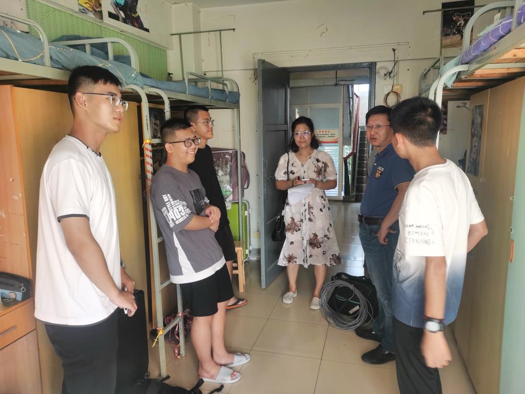 15日下午5时许,公司党委周明砚书记带领辅导员、班主任逐一走访新生寝室,了解新生状况,分发饮用水,勉励新生“雄关漫道真如铁,而今迈步从头越”。