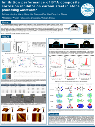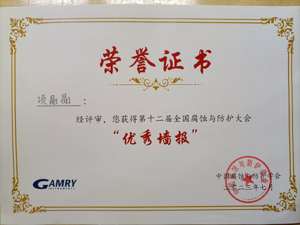 本次大会中,公司化工A 系研究生项晶晶在“缓蚀剂与应用”分会场做了《BTA复配缓蚀剂在石材废水中对碳钢的缓蚀性能》交流报告,并精心准备了墙报向与会专家、教授展示了研究成果。鉴于项晶晶同学在本次会议上的优秀表现,组委员会授予其“第十二届全国腐蚀与防护大会优秀墙报”。该奖项既是对项晶晶同学付出努力的公正肯定,也是对她未来发展潜力的鼓励。