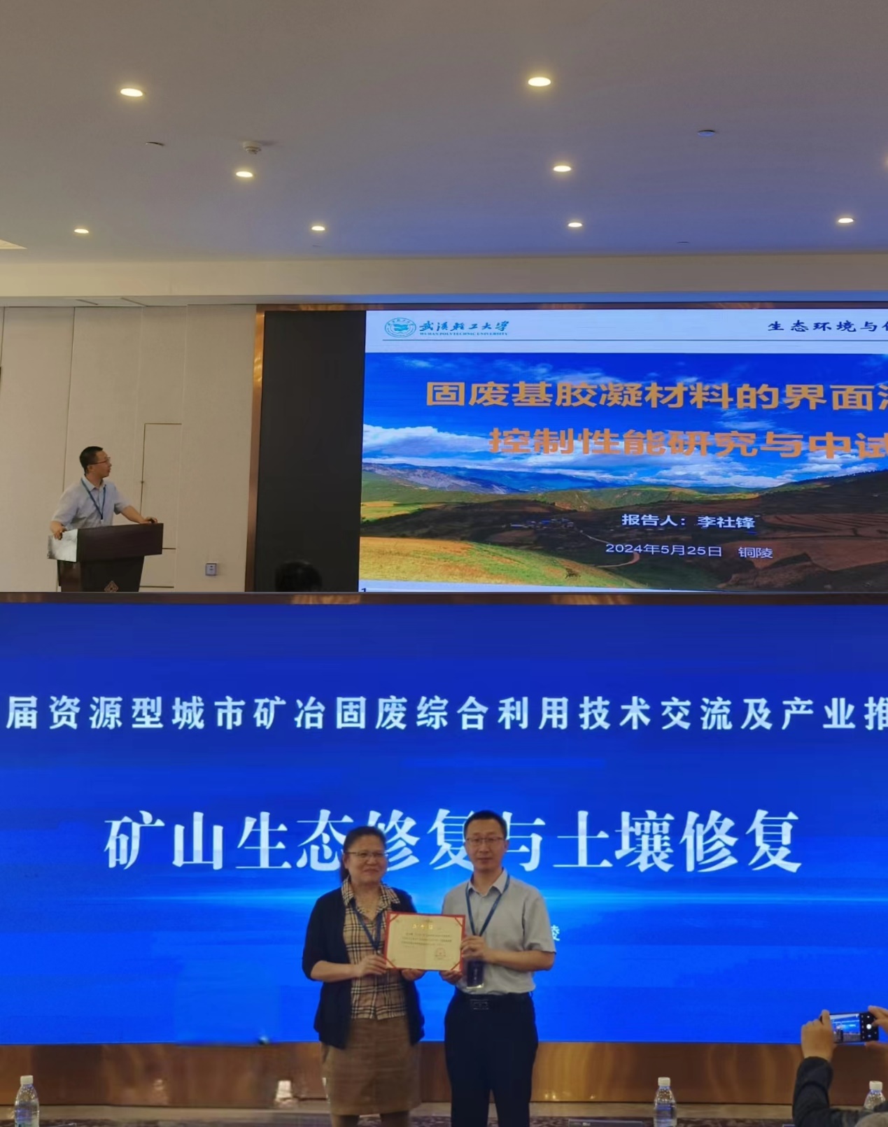 李社锋在“矿山生态修复与土壤修复”分会场作了题为《固废基胶凝材料的界面污染控制性能研究与中试》的学术报告。报告会后,主办方为李社锋教授颁发了邀请报告证书。