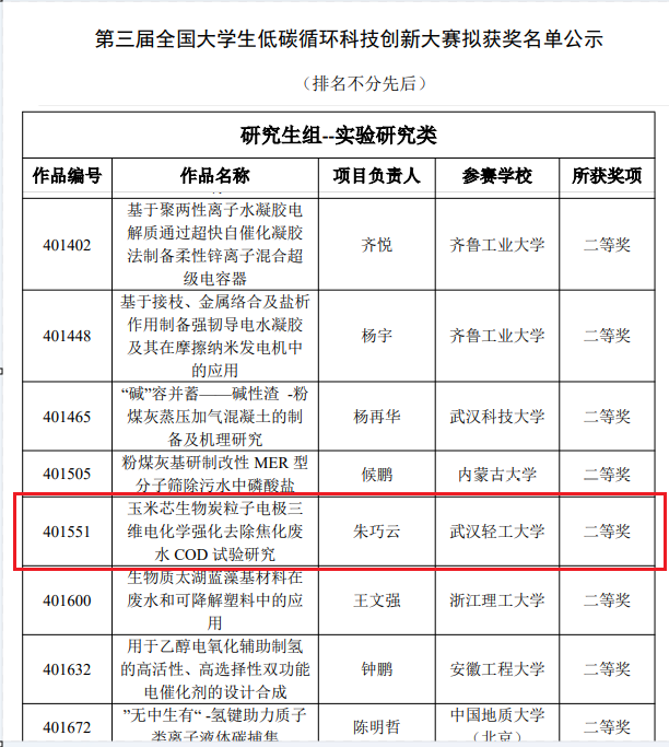 9月7日,第三届全国老员工低碳循环科技创新大赛决赛在杭州举行。公司张垒、杨琳、赵冲老师指导的“炭索未来—玉米芯生物炭粒子电极三维电化学氧化去除焦化废水COD试验研究”项目获得研究生组-实验研究类国赛二等奖。该项目是由beat365官网中文版本研究生朱巧云主持,2023级研究生任文杰和2022级本科生张万强、陈宏康、蒋典和2023级马欣宇同学共同完成。此次比赛获奖刷新了公司在该项赛事中历史最好成绩,实现公司该项赛事的重要突破,体现了公司员工科研水平和人才培养质量的成果。