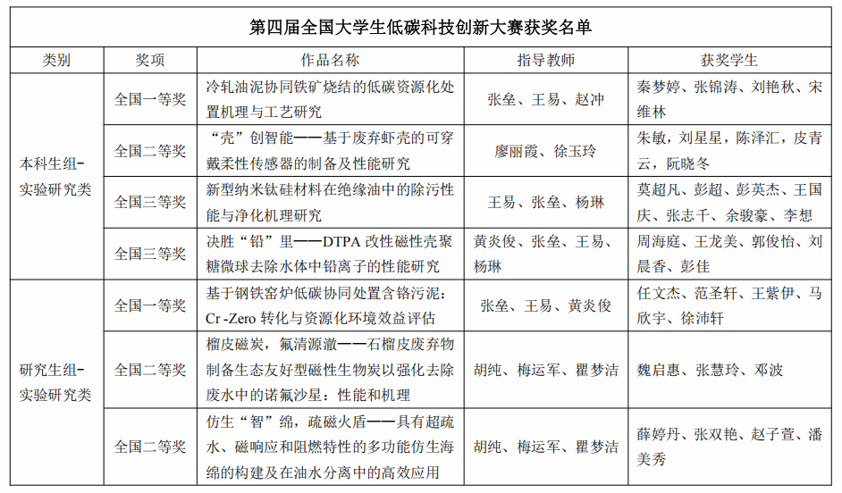 经过初赛的层层选拔和决赛的激烈角逐,公司参赛团队凭借扎实的专业功底和创新性的解决方案脱颖而出。其中,由张垒老师指导的本科生作品“冷轧油泥协同铁矿烧结的低碳资源化处置机理与工艺研究”和研究生作品“基于钢铁窑炉低碳协同处置含铬污泥:Cr -Zero 转化与资源化环境效益评估”以其前瞻性的研究视角、创新的技术路线和良好的应用前景,赢得了评委的高度认可,双双荣获全国一等奖。此外,另有3个项目获得全国二等奖(胡纯老师指导2项,廖丽霞老师指导1项),2个项目获得全国三等奖(王易老师指导1项,黄炎俊老师指导1项),获奖项目覆盖了废弃物利用、节能技术、循环经济、低碳材料等多个前沿方向。
