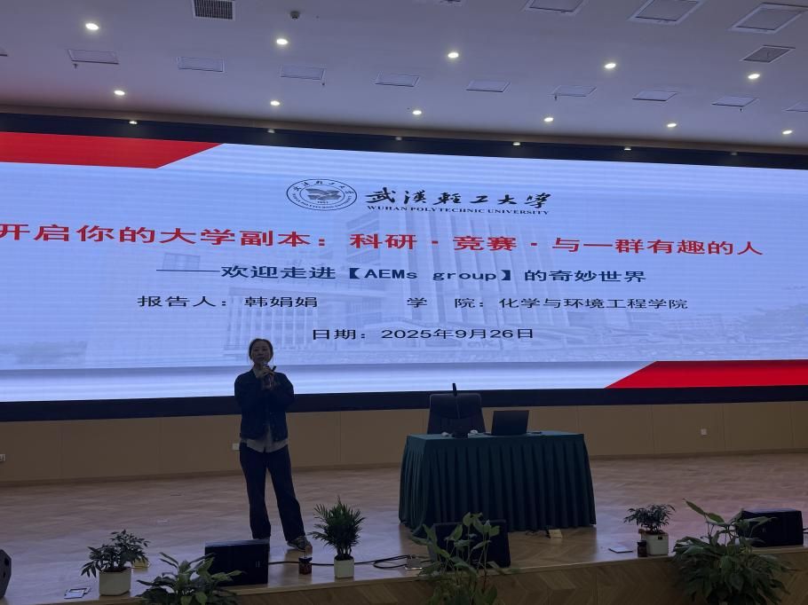 随后,韩娟娟老师携"阴离子交换膜"员工团队上台授课,带来题为《开启你的大学副本:科研 竞赛 与一群有趣的人》的沉浸式分享。韩老师以"科研成长地图"为框架,为新生规划了大学科研生涯的进阶路径,引发热烈响应。在交流环节,新生们围绕"如何平衡学业与竞赛"等话题踊跃提问,现场反响热烈。