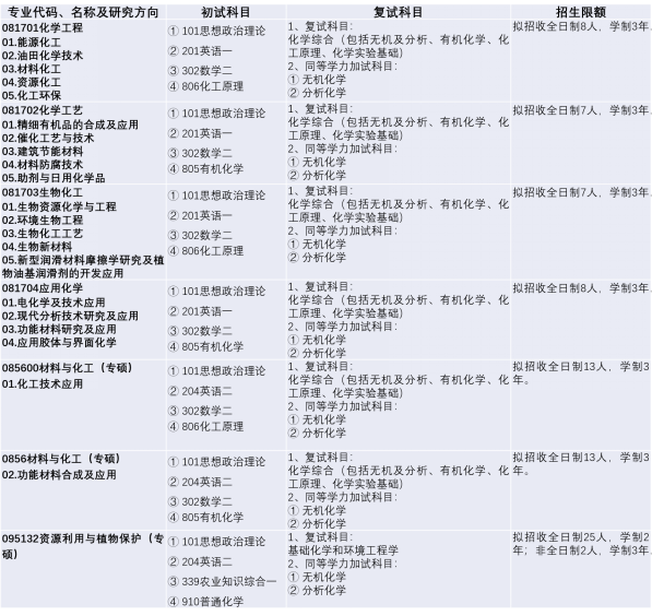 材料与化工(0856)该专业学位硕士点下设化工技术应用和功能材料合成及应用2个主要研究方向。涵盖农副资源化学工程、生物材料化学工程、新能源材料化学工程、功能材料化学工程等优势研究方向。该硕士点紧密围绕新能源和新材料产业,主要为材料与化工领域的企事业单位培养综合素养高、工程实践能力强的复合型高层次人才。