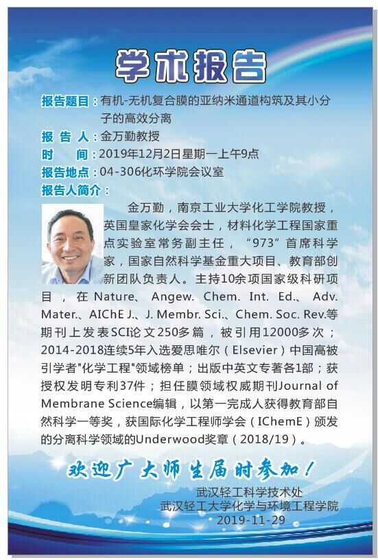 【学术讲座】有机-无机复合膜的亚纳米通道构筑及其小分子的高效分离