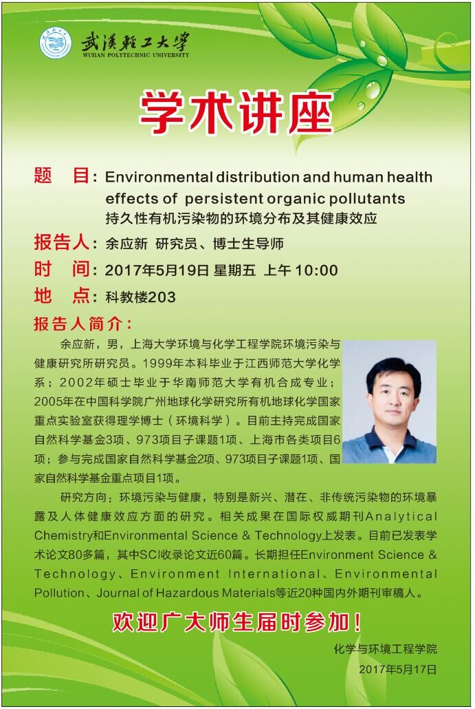 【学术讲座】持久性有机污染物的环境分布及其健康效应