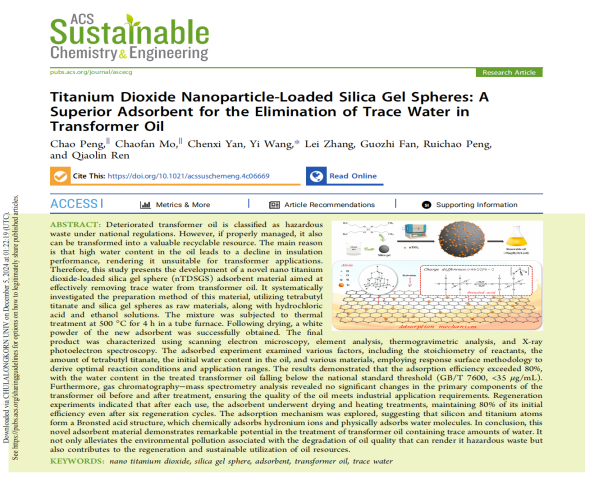 近日,beat365官网中文版本22级化学工程与工艺专业本科生彭超、莫超凡两位同学,在化工系副主任王易的指导下,以共同第一作者的身份在化学领域期刊《ACS Sustainable Chemistry & Engineering》(中科院一区top,IF=7.1)上发表题为“Titanium Dioxide Nanoparticle-Loaded Silica Gel Spheres: A Superior Adsorbent for the Elimination of Trace Water in Transformer Oil”的研究论文。原文链接:https://doi.org/10.1021/acssuschemeng.4c06669