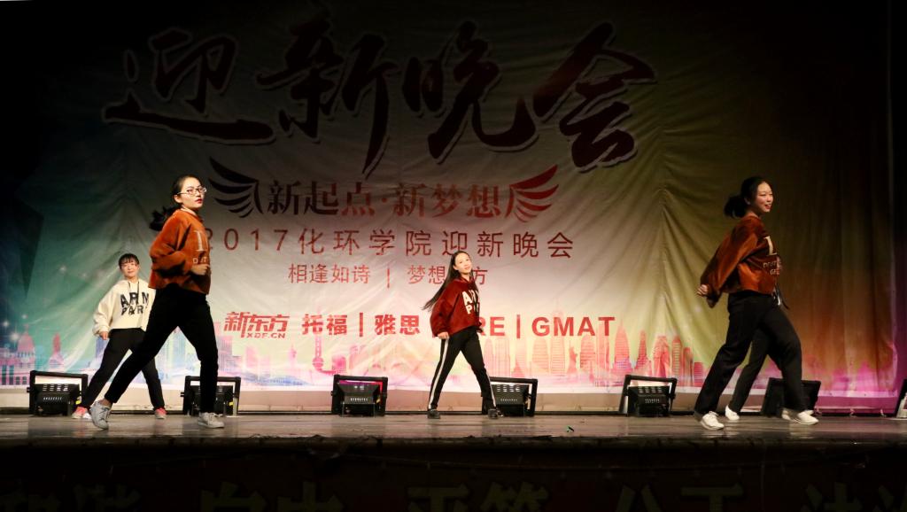 迎新晚会在文工团充满动感与活力的舞蹈《Zero》之中拉开帷幕。主持人轻松愉悦的主持氛围以及台下的观众热情的呼应贯穿全场。晚会内容丰富多样,如沙漏般流下彩色的斑斓。参演成员用美妙的歌喉诠释了音乐的力量:环工1702班与欧阳文博学长的合唱歌曲《明年今日》、化工1702班与文工团合唱歌曲《freshtime》、吉他弹唱《我要你喜欢我的内心活动》以及男女对唱《凉凉》,不同的音乐却带给了观众共同的感动。材料化学1701班小品《办公室的故事》和应用化学1701班小品《拿什么拯救你,我的兄弟》不仅令观众捧腹也极具现实意义。材料化学1701班舞蹈《咋啦登妈》和文工团舞蹈《As if it's your last》