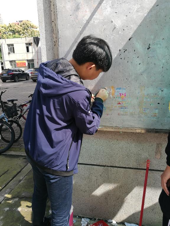 中午十二点半,参与活动的全体成员在部长高欣仪的带领下,在桂圆公寓精神文明示范区进行清扫活动。参加活动的成员分为两组,分别进行宣传栏广告摘除、地砖纸屑清理。打扫过程中,干事们积极地进行工作,团结互助,在一个多小时的共同努力下,高质量高效率地完成了清理任务。