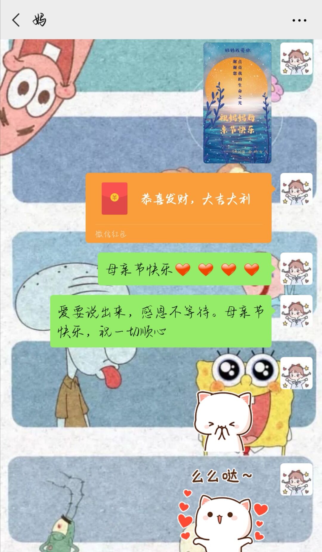 beat365官网中文版本员工会心理健康指导部在张娜老师指导下发动全院同学在母亲节这天以实际行动向母亲表示祝福与感恩。母亲节当天,有的同学走进厨房,为日夜操劳的母亲准备一餐可口的饭菜,让家庭弥漫温馨的亲情;有的同学拿起拖把扫帚,打扫家庭卫生,体会母亲的幸苦与不易;还有的同学送一束鲜花、一个蛋糕,让母亲感受到子女拳拳爱心;不少同学在母亲节给母亲发一个红包,让网络将子女与母亲的距离拉得更近,还运用谐音520给母亲最真挚的告白;更有同学送一件长裙、一盒化妆品,将时光拉回她最美丽的时候,让母女宛如姐妹。化环学子以不同的方式表达了对母亲的爱。