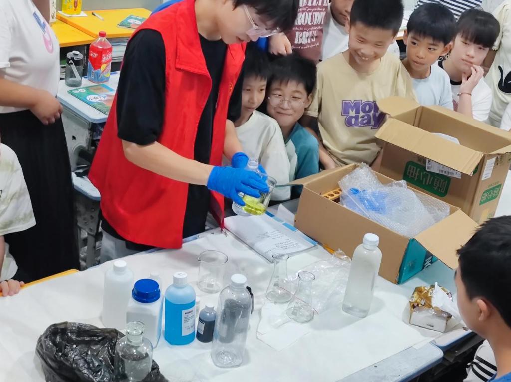在被问及以后还想不想上这样的实验课时,“想!”——这是同学们异口同声喊出的答案。於意谈到:“我在读中学的时候,只是听老师讲过这些实验,但是从来没有进实验室动手操作过,希望我的这些实验课能增加小朋友们学习的乐趣。”前期准备工作中,志愿者於意一直在挑选合适的实验,担心化学试剂的运输和储存问题,提前做了很多次预实验,当听到实验课上同学们发出的此起彼伏的惊叹声时,他感到为此的所有付出都有了回报。