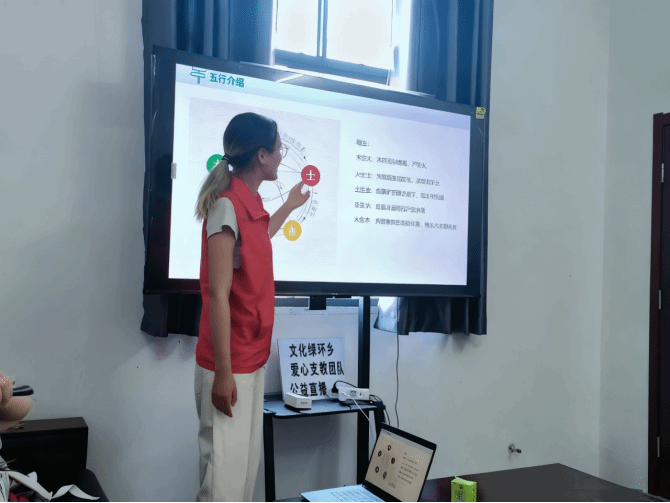 活动开始,志愿者魏芷妍播放央视纪录片《门捷列夫很忙》片段,配合PPT首页——门捷列夫肖像与元素周期表背景,迅速抓住了孩子们的注意力。在随后的互动环节,志愿者从古人对元素的朴素认知切入,深入浅出地讲解五行思想,并开展备受欢迎的五行卡牌游戏。孩子们依据“相生相克”规则,抽取“木、火、土、金、水”卡牌进行对战,现场一片欢声笑语。